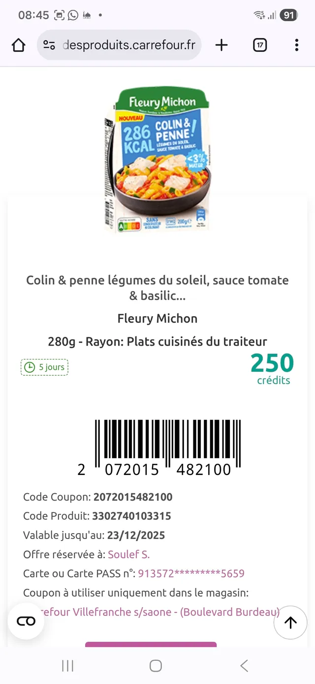 J'ai pu goûter gratuitement au plat de penne & Colin de fleury michon.